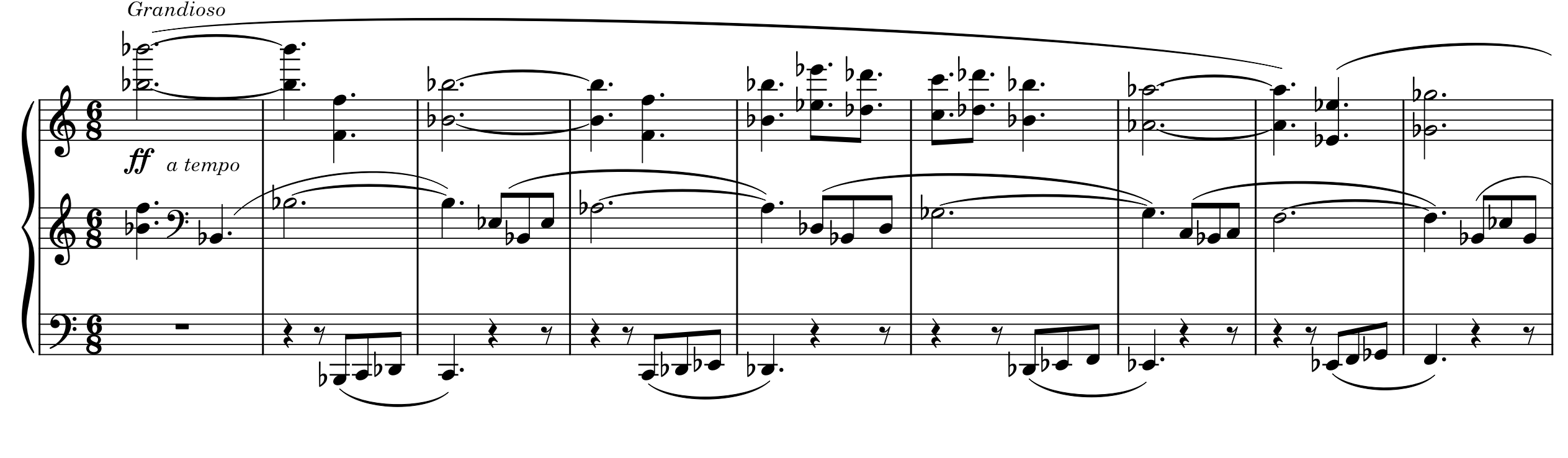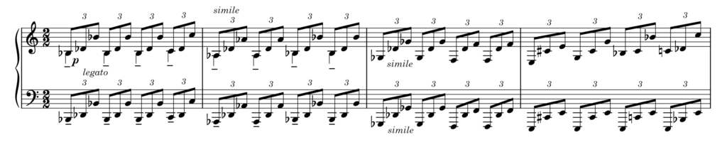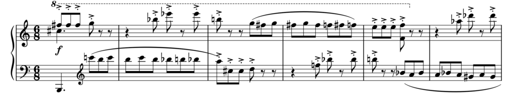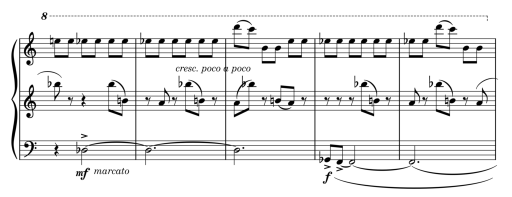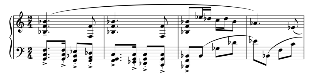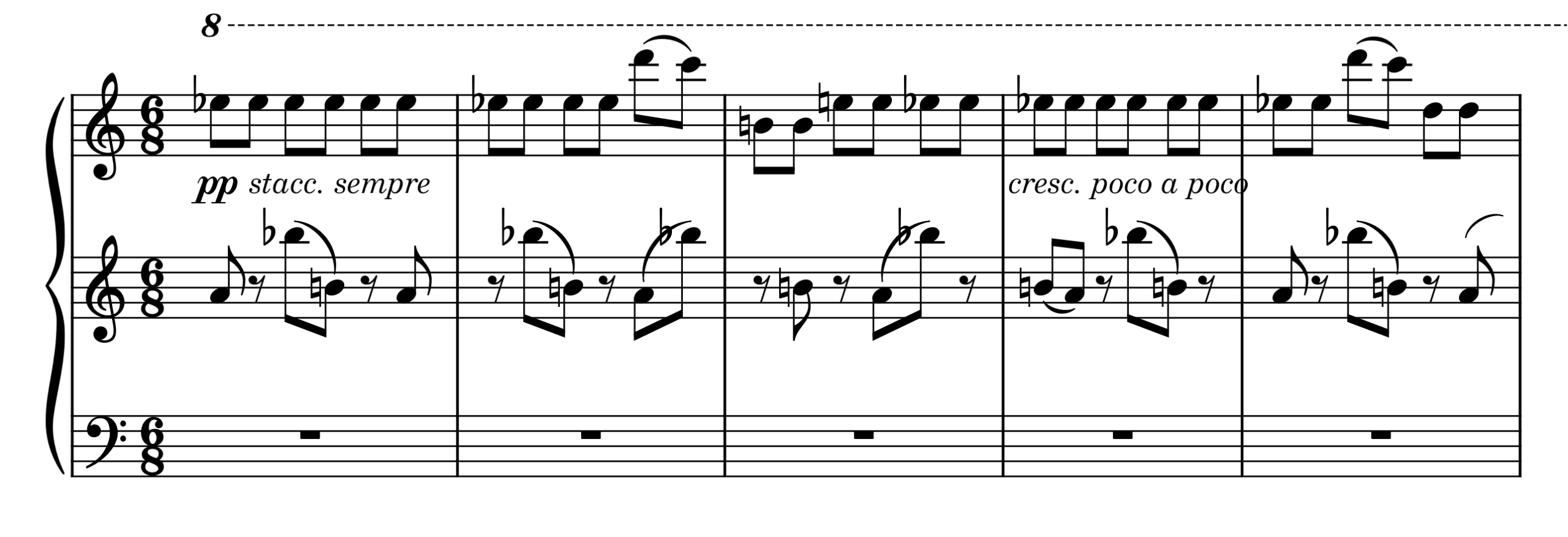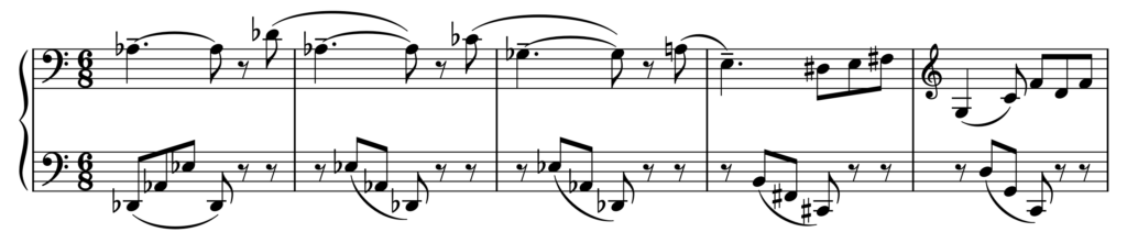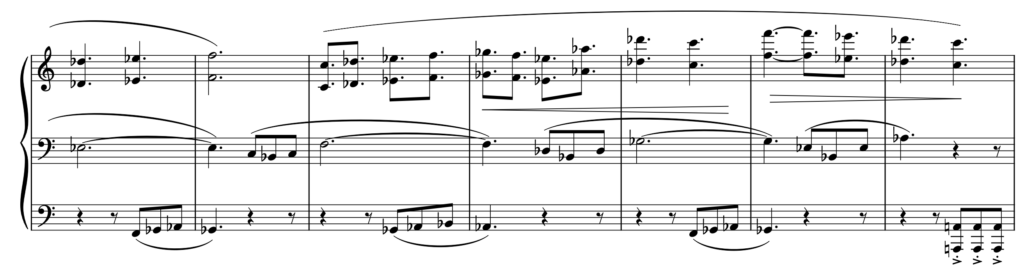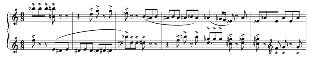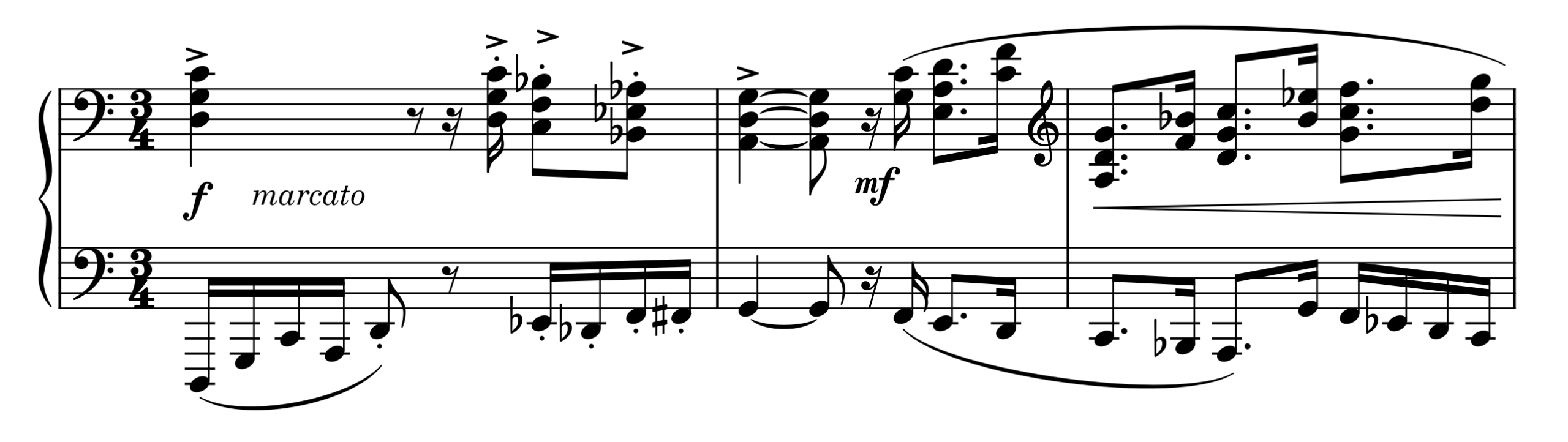 Celý drsný ráz bloku je podtržen sestupným klesáním spodního hlasu hraného levou rukou v stoupající dynamice z tónu des v „mf“ až po tón C1 v dynamice „sfff“. Zajímavostí tohoto bloku je postupné zaznění všech tónů chromatické stupnice.