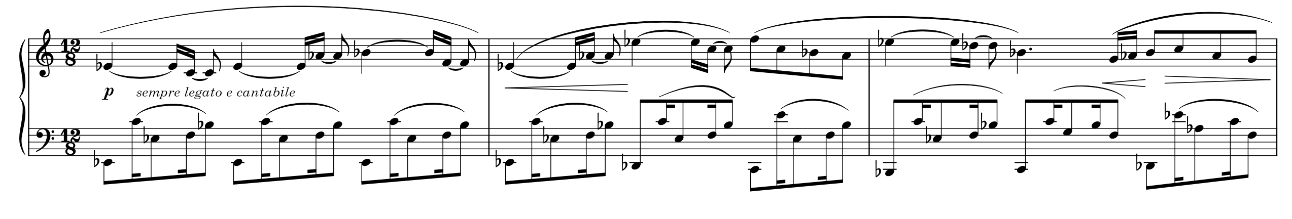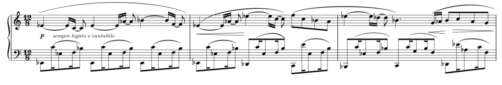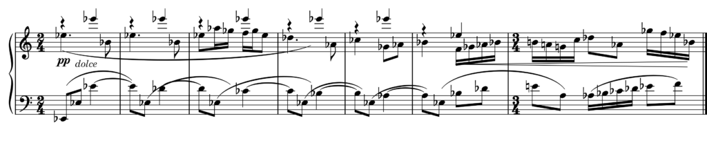 Tentokrát již nejde o materiál potřebný k přípravě zaznění hlavní hudební myšlenky třetí věty, ale je mu dána mnohem větší důležitost. Označení „pp“ a „dolce“ předurčuje jeho mimořádnou poetičnost, kterou skladatel ještě zvýraznil druhým hlasem imitujícím doslovně první hlas, avšak o osminovou hodnotu později (takt 13). V následujících třech taktech se objevuje kontrastní modulační spojka, připravující opětovné zaznění hlavní hudební myšlenky třetí věty.