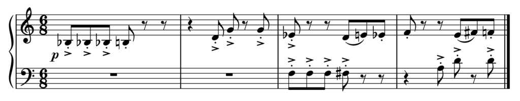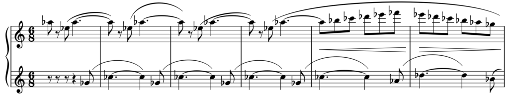 Tento prvek, v podobě sledu čtyř sestupujících tónů, se objevuje hned v prvním taktu v partu pravé ruky a je tvořen počátečním tónem hes, opakujícím se vždy na první době v dalších dvou taktech. Ve čtvrtém taktu jej vystřídá tón as, v pátém taktu tón ges a nakonec je uzavřen tónem f v šestém taktu. Stejný intervalový postup se objevuje vždy na druhé době taktu v partu levé ruky. Základní hudební myšlenka, ať již v původní verzi, či v úpravě, se vyskytuje nejen v průběhu celé první věty, ale objevuje se jako vše spojující hudební myšlenka celé sonáty i ve větě závěrečné.
